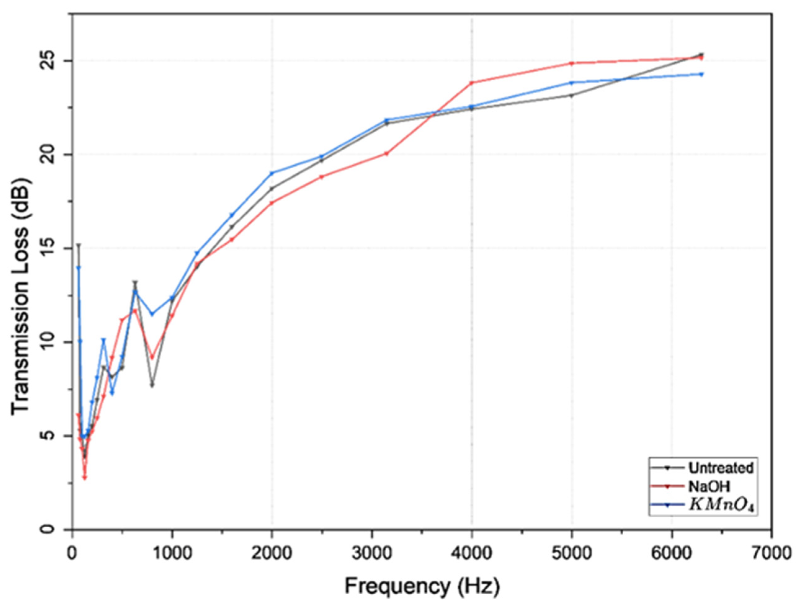 In the mid-frequency range (600–3000 Hz), the KMnO4-treated composite continues to outperform the others, reaching a TL of approximately 12.4 dB at 1000 Hz, reflecting consistent acoustic insulation improvement. The untreated sample still performs reasonably well in this range (12–12.2 dB), but the NaOH-treated sample underperforms, with TL rarely exceeding 10 dB until it reaches 1000 Hz. This suggests that while NaOH treatment improves mechanical properties, its effect on acoustic insulation in the mid-frequency range may be less pronounced or dependent on treatment parameters.
