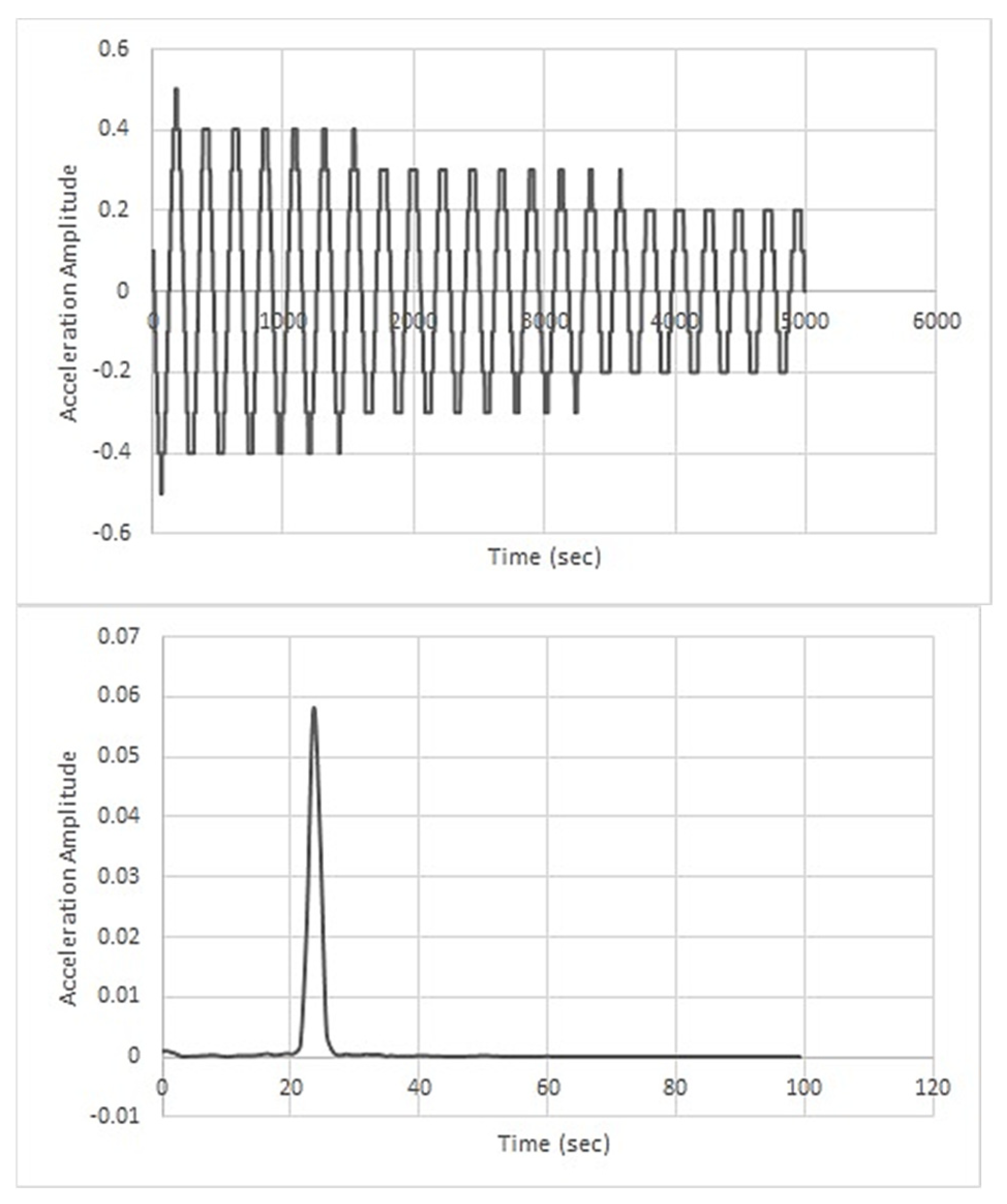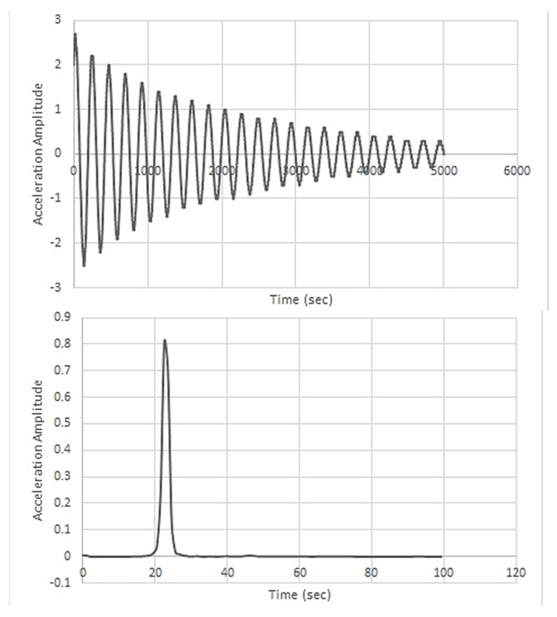 Figure 14 presents the acceleration amplitude versus time plot for the untreated banana fibre/carbon–Kevlar laminate. The untreated composite shows a natural frequency of 26.08 Hz and stiffness of 7780.23 Nm, with a low damping ratio of 0.00716. These results indicate that untreated fibres lead to weak fibre–matrix interfacial bonding due to residual lignin and waxes, causing limited energy dissipation and poor vibrational attenuation. Application-wise, such laminates will struggle in environments demanding vibration control, as persistent structural oscillations may accelerate failure or cause functional instability.