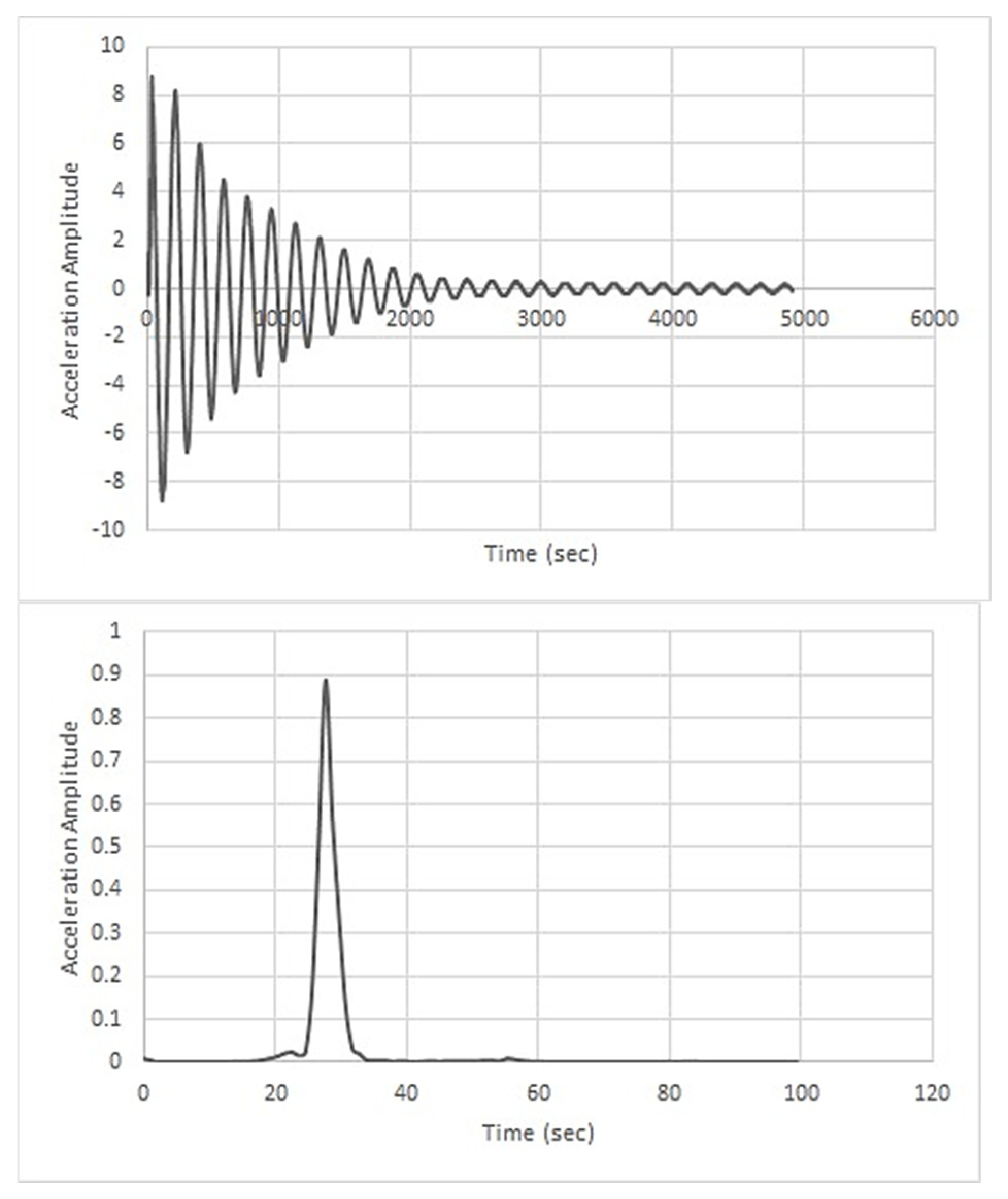 The acceleration amplitude vs. time plots of untreated as well as NaOH-and KMnO4-treated specimens are presented in Figure 14, Figure 15, and Figure 16, respectively. The untreated composite showed a natural frequency of 26.08 Hz and stiffness of 7780.23 N/m, with very low damping ratio (0.00716). These low-damping properties indicate weak fibre–matrix interfacial bonding attributed to the presence of lignin, waxes, and hemicellulose on the banana fibre surfaces, which hinders efficient load transfer and limits energy-dissipation mechanisms in the composite. Therefore, the untreated composite’s ability to attenuate vibrations is considerably weaker, indicating that its application might be limited in environments where vibration control is essential.