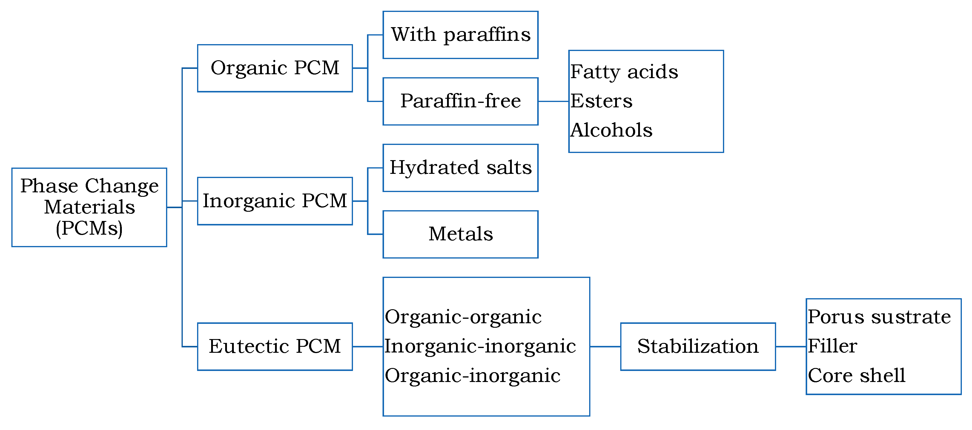 In this study, an analysis and discussion of different methods for PCMs incorporation is provided with a primary focus on eutectic salts and the challenges associated with their application, the development of new eutectic salts, and the recently explored stabilization strategies. These include incorporation of fillers, the use of porous substrates, and the implementation of nucleating agents. These strategies aim at enhancing thermal performance, reducing the degree of supercooling, and minimizing PCM leakage during phase transition [23,24].