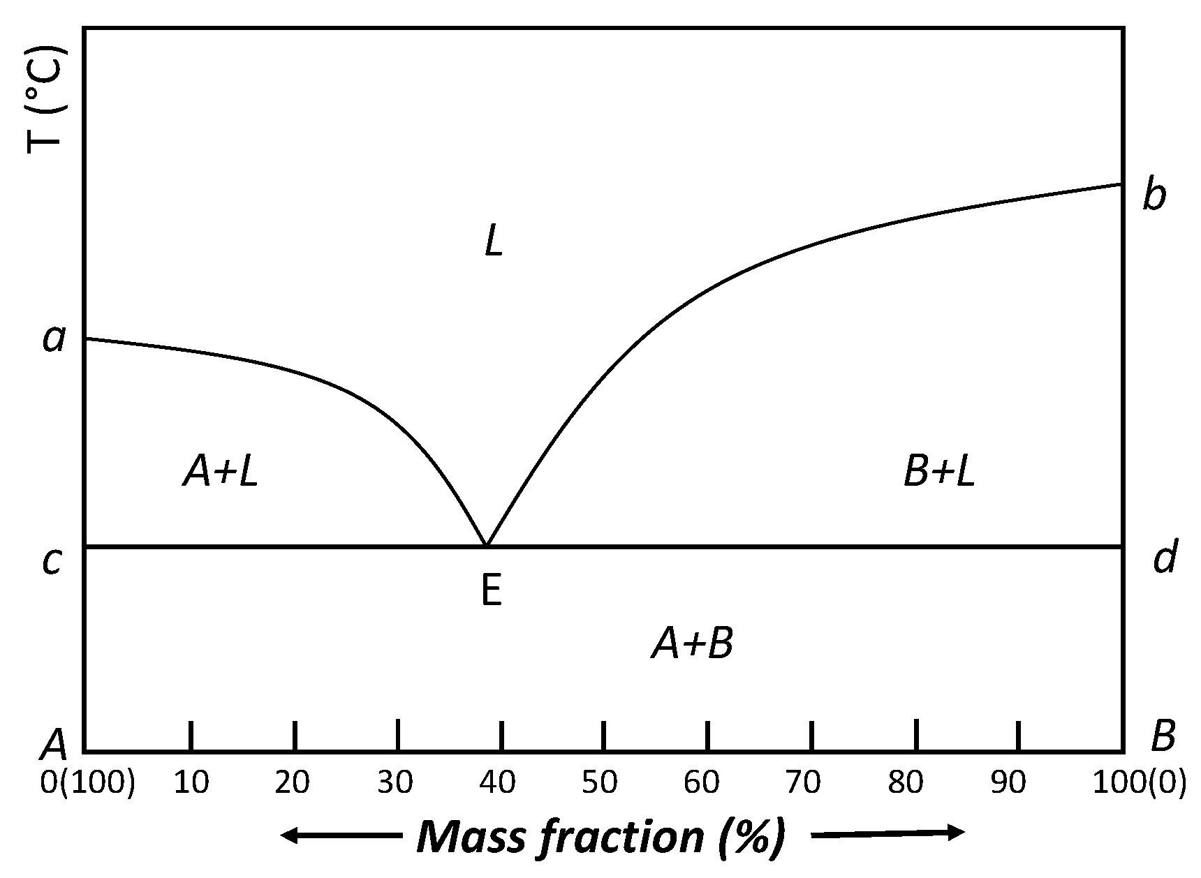 Based on the eutectic melting temperature, a phase diagram can be constructed in which the intersection point of the components defines the eutectic melting point, while the composition indicates the eutectic mixture ratio. Figure 4 illustrates a binary system where the liquid phase (L) is in equilibrium above the eutectic temperature (E), while two solid phases (A and B) constitute the equilibrium state below that temperature. The three phases can be in equilibrium at the eutectic temperature, but only at the eutectic composition [28,53].