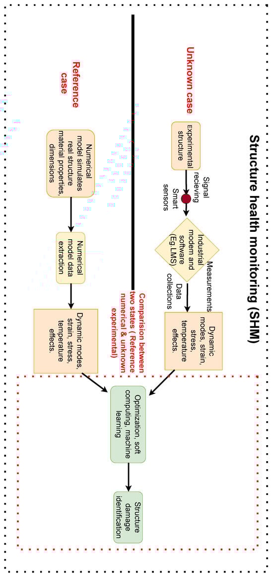 The example presented in Figure 2 illustrates the use of unknown and reference states for comparison with a dynamic or material parameter to detect damage. SHM monitors the behavior of composite structures through various metrics and damage-sensitive features (dynamic characteristics and time domain coefficients) [31]. SHM can evaluate the structural integrity of a building by analyzing various measurements and damage-sensitive factors, including vibration parameters and time domain model coefficients [32]. The authors of [20] examined the historical development of several damage-identification techniques in the field of composite structures. Other comprehensive reviews [33,34,35] of SHM have discussed notable progress in the area of damage identification. Wave-propagation-based SHM techniques for studying simple harmonic motion utilize a cyber–physical co-design approach based on wireless sensor networks [36]. The authors of [37] presented the use of SHM for cyber–physical systems based on wireless sensor networks. The authors of [38] examined the efficiency of feature selection and its use for learning inspection patterns for SHM. The authors of [39] addressed the state of the art of guided waves for SHM of aerospace composite structures.