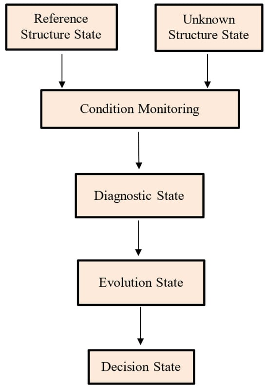 Several approaches for detecting, locating, and evaluating the extent of composite structural damage have been reported on in the literature. Vibration methods rely on the structural change, as damage causes a noticeable change in the dynamic behavior of the structure. There is a demand for a fully automatic SHM system based on vibration signals. The authors of [40] offered an overview of damage detection methods and condition monitoring for bridge structures. The authors of [41] reviewed damage detection approaches that account for linear and nonlinear variations in vibration measurements. SHM provides five steps for monitoring and maintaining structural integrity (detection, localization and classification, assessment, and prediction). The various stages are depicted in Figure 3. The authors of [42] classified damage-identification methods according to the level of damage identification; the aims are described here: