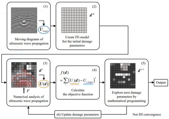 Optimization-based techniques have emerged as a powerful tool for identifying damage in composite structures. Optimization techniques [95] can be used to solve multi-engineering structural problems, as well as for the critical requirement of SHM. Several studies in the literature have identified composite damages using optimization methods. These identifications can be performed to minimize the difference between experimentally tested and predicted responses, as shown in Figure 2, and hence indicate the presence of delamination, matrix cracking, or fiber breakage. Damage identification optimization is often framed as minimizing the objective function using an inverse problem approach [96,97]. Here, the damage parameters are defined as design variables and the objective functions are defined by dynamic or steady-state structural responses.