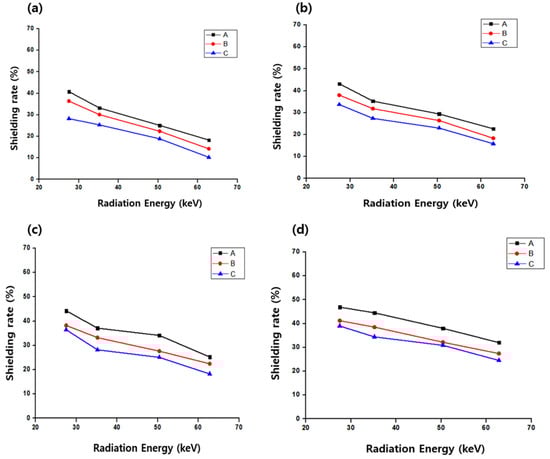 Variation in the shielding performance of the modeling pack with different compositions: A, 50% bismuth oxide and 10% zinc oxide; B, 40% bismuth oxide and 20% zinc oxide; C, 30% bismuth oxide and 30% zinc oxide; alginate was fixed at 40%. (a) 0.5 mm, (b) 1.0 mm, (c) 1.5 mm, and (d) 2.0 mm present the changes in shielding efficiency according to coating thickness.