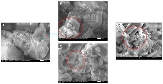 Scanning electron microscopic (SEM) images of composites prepared with bismuth oxide and zinc oxide: (A) 10% zinc oxide, (B,C) 20% zinc oxide, and (D) 30% zinc oxide. The circled region in image B shows particle agglomeration accompanied by the formation of voids, whereas the circled region in (C) indicates well-dispersed particles with appropriate interparticle spacing. The circled region in (D) does not represent individual particles but rather an agglomeration of the base material.
