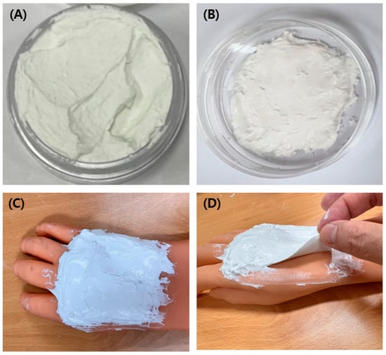 Comparison between the developed modeling pack and a shielding cream: (A) shielding cream prepared with barium sulfate; (B) modeling pack containing 50% bismuth oxide, 10% zinc oxide, and 40% alginate; (C) shielding cream applied on the dorsal hand; and (D) modeling pack applied on the dorsal hand.