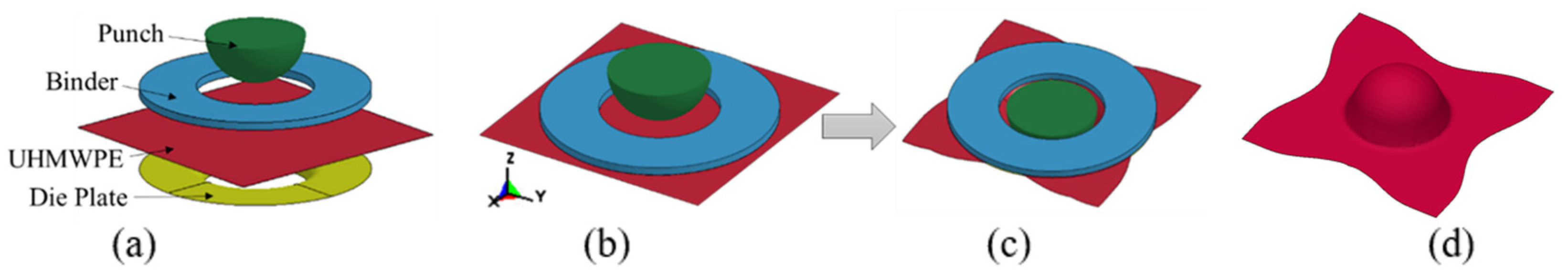 - Yeager, M.; Cline, J.; White, K.; Bogetti, T.; Sherwood, J. Characterization and Modeling of the In-Plane Shear Deformation in Ultra-High Molecular Weight Polyethylene (UHMWPE) Composites. 2019. Available online: https://apps.dtic.mil/sti/pdfs/AD1080467.pdf (accessed on 30 November 2025).