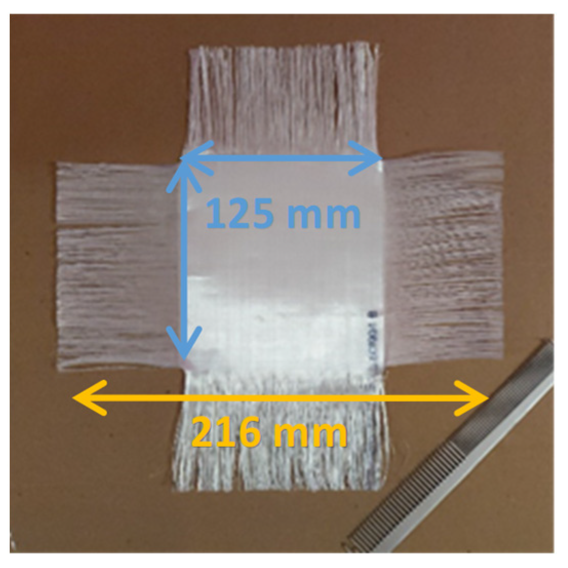 - Boisse, P.; Wang, P.; Hamila, N.; Lemeur, K.; Rusanov, A.; Guzman, E.; Ferretti, M.; D’AGostino, M.; Madeo, A. Bias Extension Test for in-Plane Shear Properties During Forming—Use at High Temperature and Limits of the Test. Key Eng. Mater. 2015, 651–653, 369–374. [Google Scholar] [CrossRef]