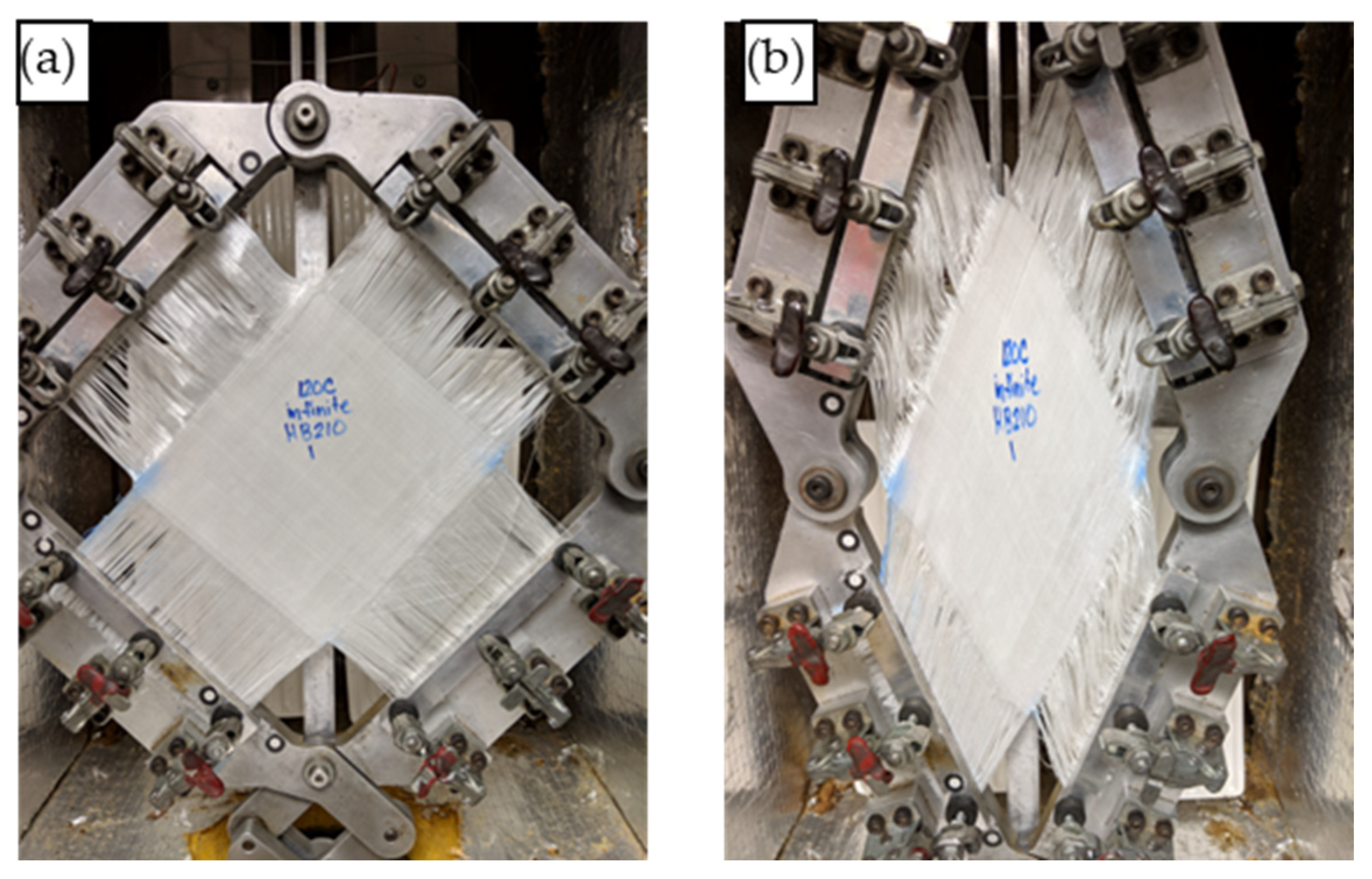 - Milani, A.; Nemes, J.; Lebrun, G.; Bureau, M. A comparative analysis of a modified picture frame test for characterization of woven fabrics. Polym. Compos. 2010, 31, 561–568. [Google Scholar] [CrossRef]