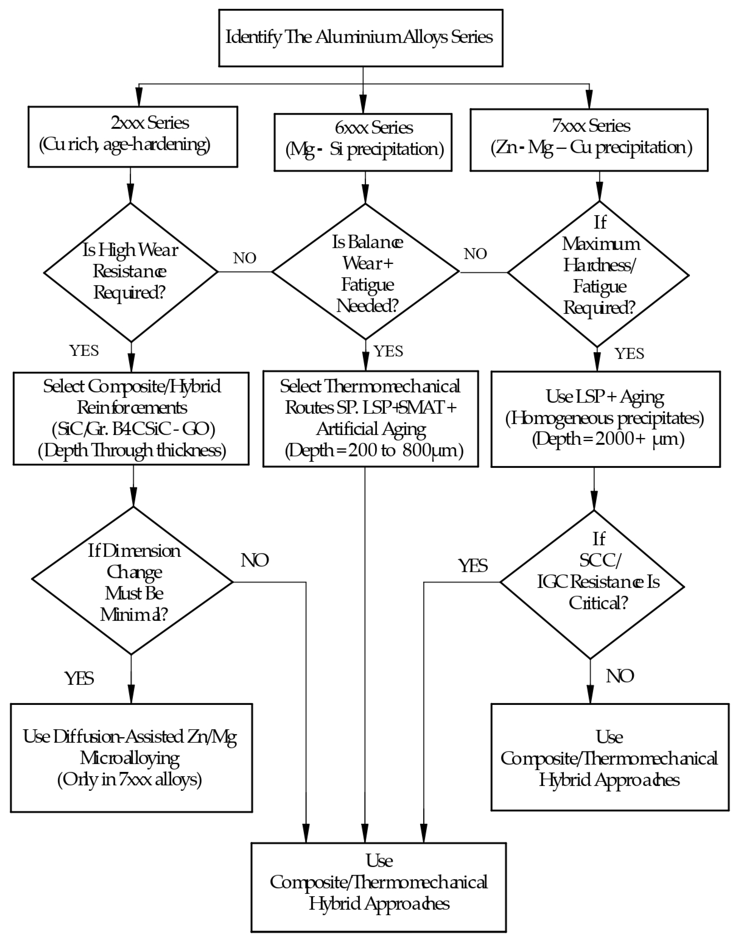 - Present comparative evaluation tables, strengthening mechanism maps, and method selection flowcharts for precipitation hardenable alloy families (2xxx, 6xxx, 7xxx) and commercially pure grades.