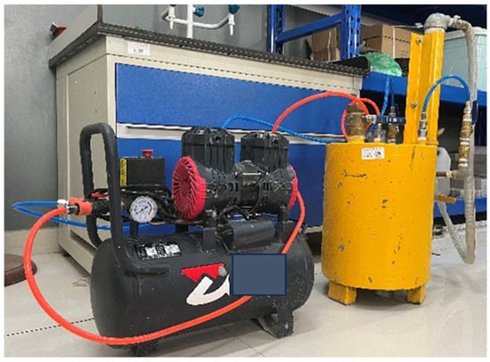 This study used Ningxia Yinchuan Saima ordinary portland cement, which has a 28-day compressive strength of 51 MPa. The basalt fibers were sourced from Liaoning JinShi Science and Technology Co., Ltd. (Shenyang, China), were 6 mm long, as shown in Figure 1. The primary mechanical property indices of the basalt fibers are detailed in Table 1. The blowing agent used was a commercially available animal protein blowing agent, and the mixing water was tap water from the laboratory. The specific preparation process for the test sample is as follows: (1) A foaming liquid is created by mixing the blowing agent and water in a quality ratio of 1:40. The weighed foaming liquid is injected into the foaming equipment (see Figure 2), where stable and uniform bubbles are generated by controlling the airflow rate; (2) Cement and water are mixed to form a cement slurry with a water-to-cement ratio of 1:2. The mixture is stirred for two minutes; (3) The weighed basalt fiber is uniformly mixed into the cement paste and stirred for an additional 2 min; (4) Air bubbles are introduced into the homogeneous fiber cement paste, with the foam dosage adjusted to control the density of the foam concrete. A low-speed mixing is performed for 1 min to achieve a uniform basalt fiber foam concrete slurry; (5) The basalt fiber foam concrete slurry is poured into a dumbbell-type test mold and allowed to stand at room temperature for 24 h; (6) The specimens are demolded and cured in a curing box (China Academy of Building Research, Beijing, China) for 28 days, with the temperature maintained at 20 °C and the relative humidity at 95%.