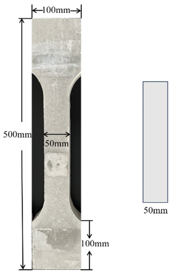 Three groups of uniaxial quasi-static tensile specimens with different matrix densities were designed for testing. The tensile specimens were dumbbell-shaped (see Figure 3 for detailed dimensions), with each group containing six specimens with different fiber content but the same matrix density. This resulted in a total of 18 quasi-static tensile specimens. Two test variables were considered: foam concrete density and basalt fiber volume dosing. The designed densities of foam concrete were 900 kg/m3, 1050 kg/m3, and 1200 kg/m3, while the basalt fiber volume dosages were 0%, 0.1%, 0.2%, 0.3%, 0.4%, and 0.5%. The length of the basalt fiber was 6 mm, and the physical drawings of a set of specimens are provided in Figure 4.
