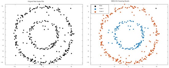 DBSCAN (Density-Based Spatial Clustering of Applications with Noise) is a very popular and powerful unsupervised machine learning algorithm that is primarily used to discover clusters in data [37]. Unlike other clustering algorithms such as K-means, DBSCAN does not require the number of clusters to be pre-specified and is capable of recognizing clusters of arbitrary shapes, as well as marking data points that are considered noisy. The core concept of DBSCAN is to define clusters based on density. The core principle relies on two important parameters: (1) Epsilon (): defines the distance threshold from a given point to another point. If the distance between two points is less than or equal to , they are considered “neighboring”. (2) MinPts (): Indicates the minimum number of neighboring points (including the point itself) required for a point to be considered as a core point. For more details, refer to reference [38,39]. An example plot of the DBSCAN clustering method is given in Figure 6.