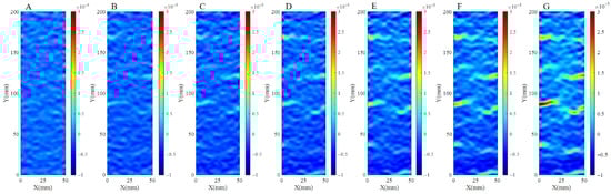 The tests were performed using the DIC method to obtain full-time and full-field displacement and strain information from the specimen surface during the loading process. Under tensile loading, the tensile strain in the vertical direction plays a decisive role in the tensile damage process. Therefore, vertical strain () was selected as the analysis factor, and seven characteristic points (A–G, Figure 7) were chosen from the displacement-load curve to analyze the tensile damage process of BFFC. It is important to note that the size of the strain calculation window significantly influences the results of strain field calculations using DIC. This study reflects the localization of damage (strain localization) in the material under tensile loading by accurately calculating strains. Figure 8 illustrates the strain results obtained from different strain windows along the yellow dashed line on the specimen surface. It demonstrates that a smaller strain window is more sensitive to significant strain regions and can accurately reflect their deformation. In contrast, a larger strain window tends to over-smooth the displacement data, leading to distorted strain information. Consequently, this paper uses a strain calculation window size of 5 × 5. Figure 9 shows the distribution of strain evolution in the vertical direction at each characteristic point (A–G, with loads gradually increasing) of the BFFC-900 specimen without basalt fiber. Comparative analyses indicate that the tensile damage process of the BFFC can be categorized into three distinct stages: the microcrack initiation stage, the microcrack synergy stage, and the main crack development stage. Microcrack initiation stage (B–C): The overall vertical tensile strain level of the specimen is low at this stage. However, a more obvious strain concentration area has appeared in the local area at the edge of the specimen, indicating that microcracks have begun to emerge there. Microcrack synergistic stage (C–E): In this stage, with the increase in load, multiple microcracks form and develop synergistically in the specimen. Significant strain concentration occurs in the local area (especially in the main crack formation area), which is much higher than in other areas. In the latter part of this stage, main cracks gradually form. Main crack development stage (E–G): The main crack forms in the middle of the specimen near the left edge. The vertical tensile strain at this position is significantly higher than that in other areas. With the continuous load increase, this strain difference expands dramatically, which ultimately leads to specimen fracture at the main crack.