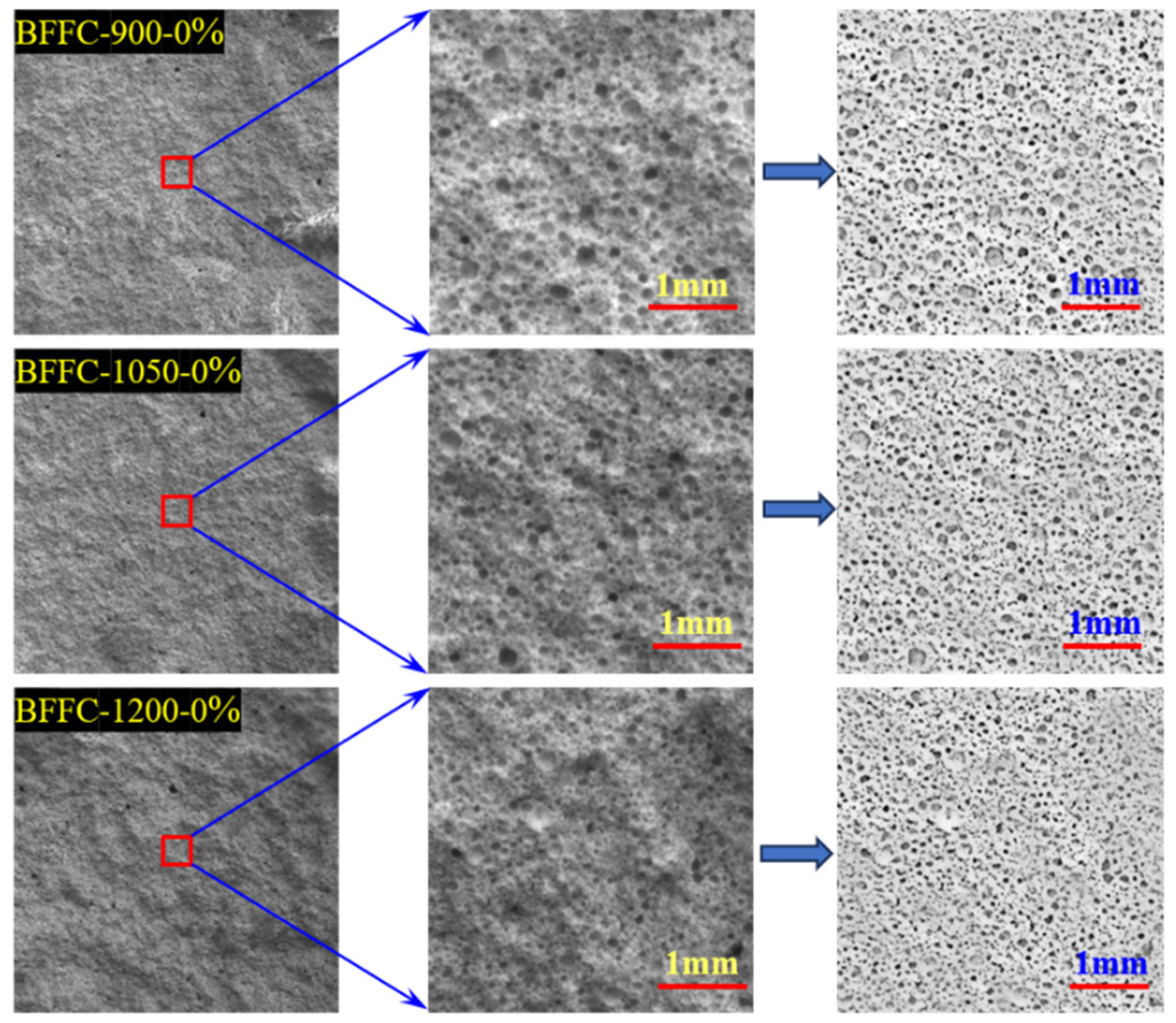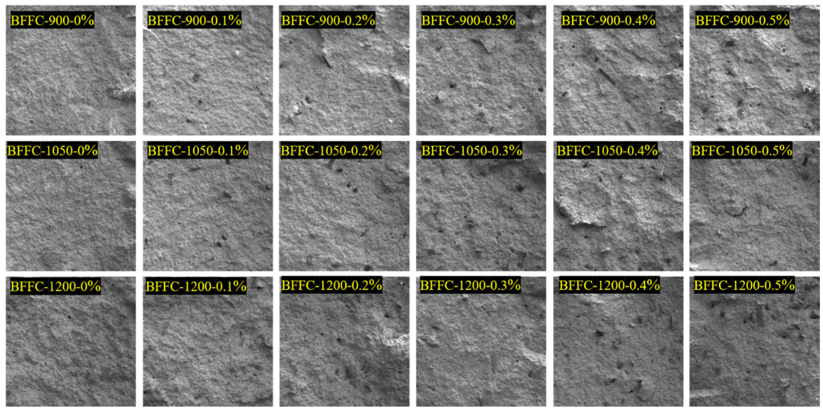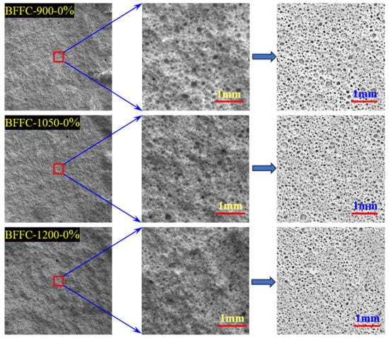 As illustrated in Figure 11, the optical images of the fracture surfaces of all the specimens after fracturing are presented. It has been observed that, as the content of basalt fibers increases, the corresponding fracture surfaces become increasingly irregular. This phenomenon can be attributed to the fact that the process of fiber pull-out requires the expenditure of additional energy to overcome interfacial friction and adhesion forces. During this process, the fibers are pulled out of the matrix, leaving pits (where the fibers were pulled out) and protrusions (fiber tips remaining in the matrix) on the fracture surface. The numerous fiber pull-out marks are the primary cause of the rough and uneven fracture surface. Additionally, due to factors such as the strength distribution of the fibers themselves, differences in their orientation within the matrix, varying local stress states, and the presence of micro-defects, the fracture location for different fibers does not typically occur on the same plane. This significantly increases the irregularity of the fracture. Figure 12 shows a magnified image of the fracture surface of three samples with different matrix densities without basalt fiber reinforcement. Through appropriate image processing, it can be seen that, under the same preparation process, the main difference between foam concrete with different matrix densities is the size of the foam particles. The higher the matrix density, the smaller the corresponding foam particle size.