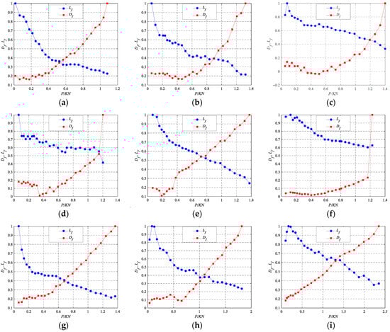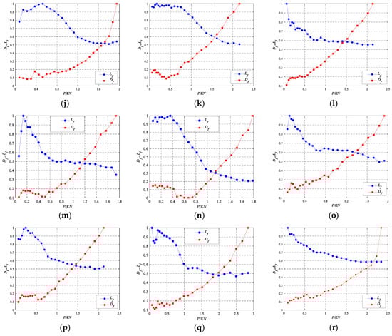 Variation of and with increment of load for all specimens. (a) BFFC-900-0%, (b) BFFC-900-0.1%, (c) BFFC-900-0.2%, (d) BFFC-900-0.3%, (e) BFFC-900-0.4%, (f) BFFC-900-0.5%, (g) BFFC-1050-0%, (h) BFFC-1050-0.1%, (i) BFFC-1050-0.2%, (j) BFFC-1050-0.3%, (k) BFFC-1050-0.4%, (l) BFFC-1050-0.5%, (m) BFFC-1200-0%, (n) BFFC-1200-0.1%, (o) BFFC-1200-0.2%, (p) BFFC-1200-0.3%, (q) BFFC-1200-0.4%, (r) BFFC-1200-0.5%.