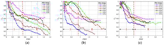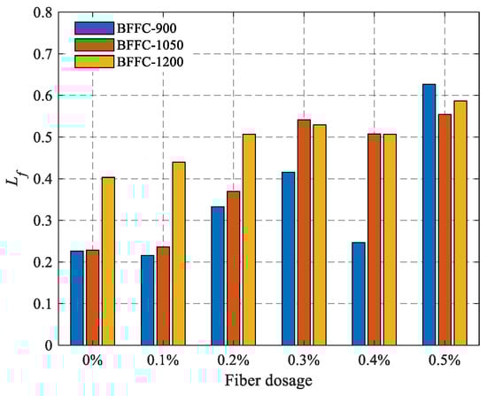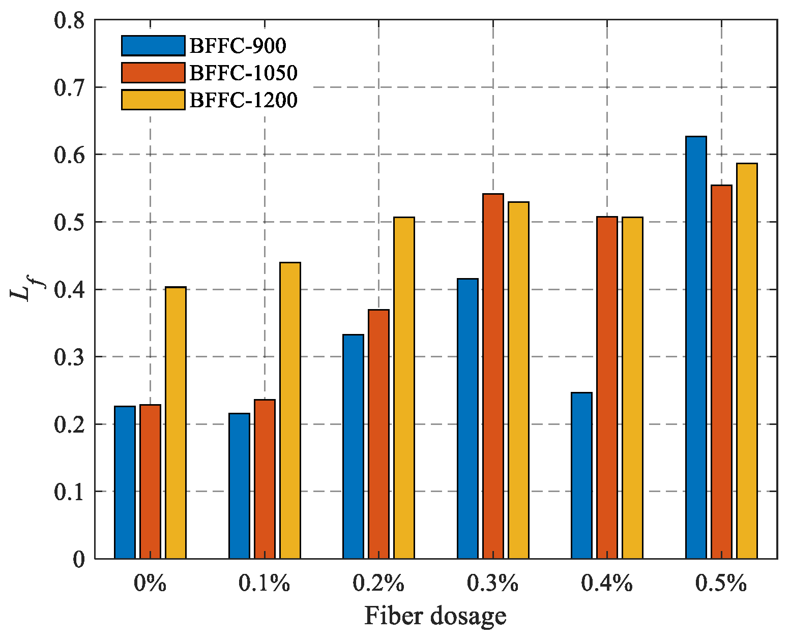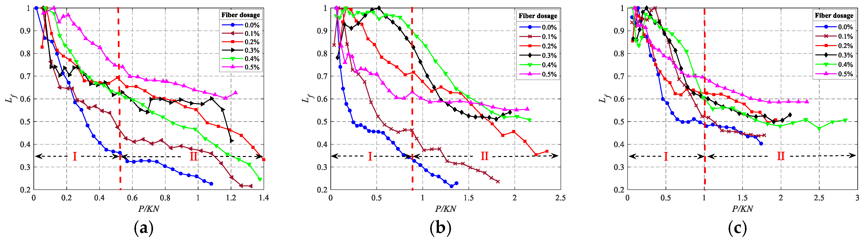 Figure 16 shows the variation curve of the localization coefficient with load. Similar to the pattern described in Section 3.3.1, this curve can also be divided into two distinct stages: Stage I: During this stage, the discretely distributed high tensile strain points gradually converge toward the local region of the specimen, forming a potential damage concentration zone. In this stage, the incorporation of fibers effectively suppresses the localization of strain. At the same load level, the localization coefficient increases with the increase in fiber content, indicating that fibers disperse stress and promote a more uniform stress distribution. Stage II: After entering this stage, the rate of decrease in the localization coefficient with increasing load significantly slows down. The main reason is that the primary damage zone (the primary crack zone) has essentially formed in this stage. Further increases in load primarily lead to the continued expansion of the main damage zone, while other secondary damage zones stabilize as stress is released. It is worth noting that fibers also have a certain inhibitory effect on the development of damage in the main damage zone during this stage. Figure 16 also shows that, at this stage, the higher the fiber content, the larger the corresponding localization coefficient, reflecting that higher fiber content can more effectively inhibit the rapid expansion of the main damage zone. Additionally, Figure 17 presents bar charts showing how the localization coefficient varies with fiber content for three different matrix density specimens at the moment of failure. This figure visually compares the influence of fiber content on damage localization at the moment of failure under different matrix densities.
