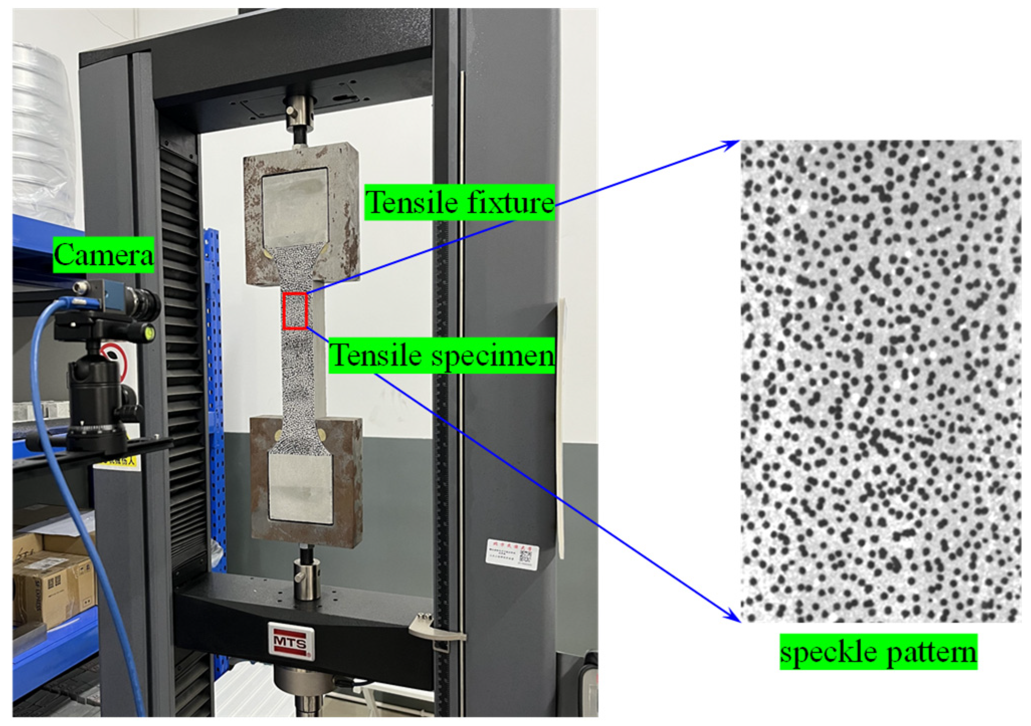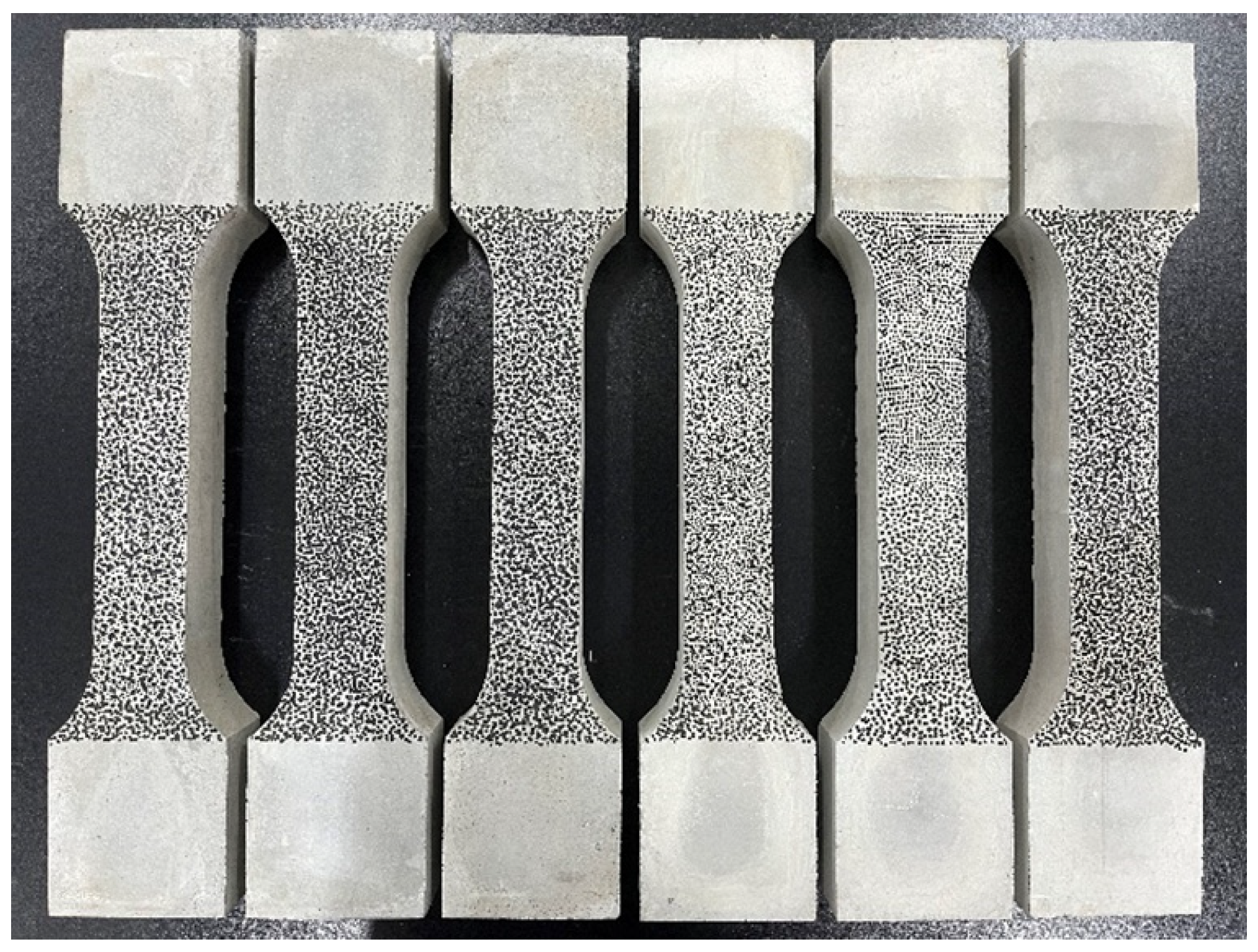 The quasi-static tensile test was performed using an MTS Exceed E44.304 microcomputer-controlled electronic universal materials testing machine (MTS, Eden Prairie, MN, USA) (see Figure 3). Due to the brittle nature of foam concrete, the experiment used displacement loading control and applied a relatively low loading rate of 0.2 mm/min. This study integrates the digital image correlation method with cluster analysis to quantitatively assess tensile damage localization in fiber-reinforced foam concrete. To facilitate this, a CCD camera (China Daheng (Group) Co., Ltd., Beijing, China) was positioned in front of the tensile specimen to capture real-time surface images under varying loading conditions. The CCD image acquisition device has a resolution of 3088 × 2064 pixels, with an imaging area of 420 mm × 280 mm. When analyzing the experimental results, the size of the speckles on the specimen surface has a significant influence on the measurement accuracy of the DIC method. The size and uniformity of the speckles produced by different fabrication techniques can vary considerably. According to references [34,35,36], the ideal speckle size is between 4 and 6 pixels. Considering the specimen size in this experiment, we used a method of randomly applying spots with a black marker to create speckles, thereby ensuring randomness and uniformity in their distribution (see Figure 5). In the DIC calculation process of this article, the size of the displacement calculation subset is 31 × 31, and the calculation step size is 10.