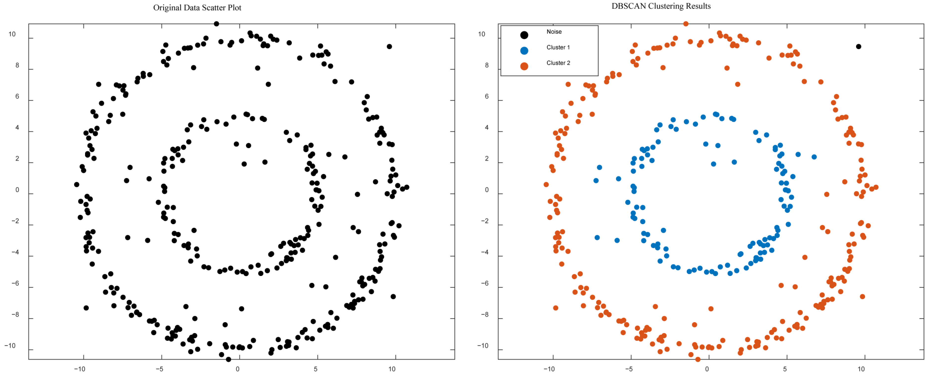 DBSCAN clustering example graph (left: original data scatter plot, right: DBSCAN clustering results).