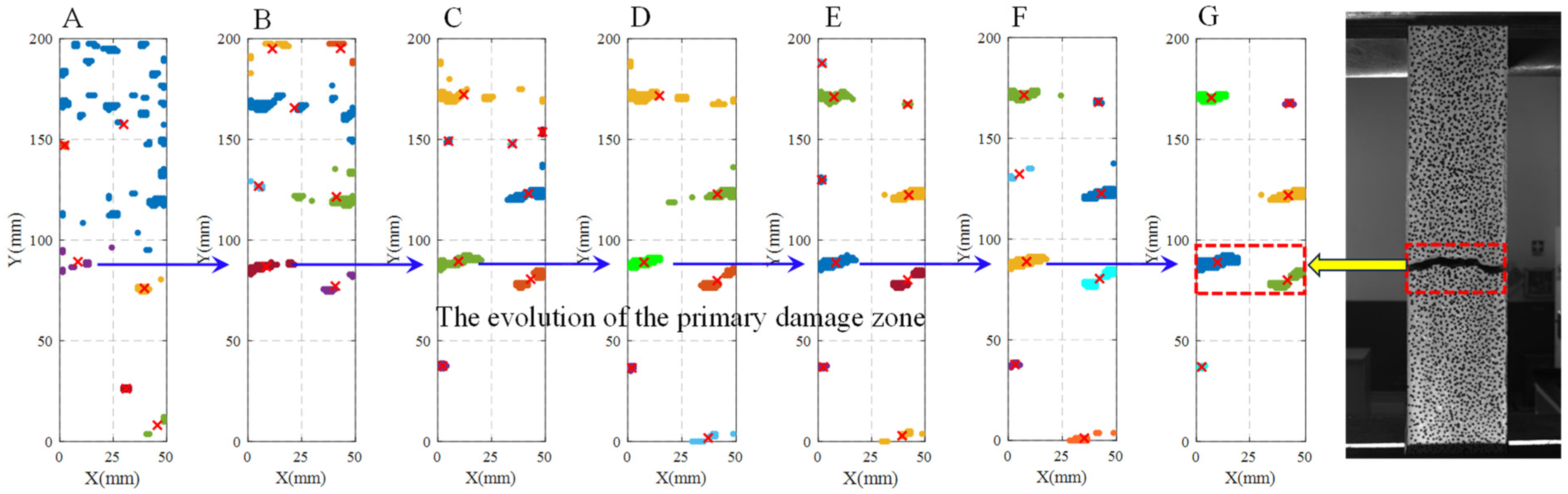 Section 2.4 of this paper states that the core principle of DBSCAN relies on two important parameters: Epsilon () and MinPts (). According to the strain data characteristics in this paper, take = 10, = 3. Figure 13 shows the DBSCAN clustering results for the top 181 tensile strain points in the vertical direction at each load level corresponding to Figure 9. In each figure, different colored regions represent different strain classes and red crosses indicate the cluster centers corresponding to the same color class. Under the initial loading condition, it can be seen that the high tensile strain points on the specimen surface exhibit a discrete distribution, indicating that no obvious damage regions have yet formed at this stage. As the load increases (stages B to E), the high tensile strain points begin to aggregate and evolve in localized regions, clearly showing the emergence and continuous development of multi-regional damage. In the later loading stage (stages E to G), the main damage zone gradually forms and dominates the damage evolution process, while the development of other secondary damage zones tends to slow down or stagnate. Ultimately, the specimen fractures and fails in the main damage zone.