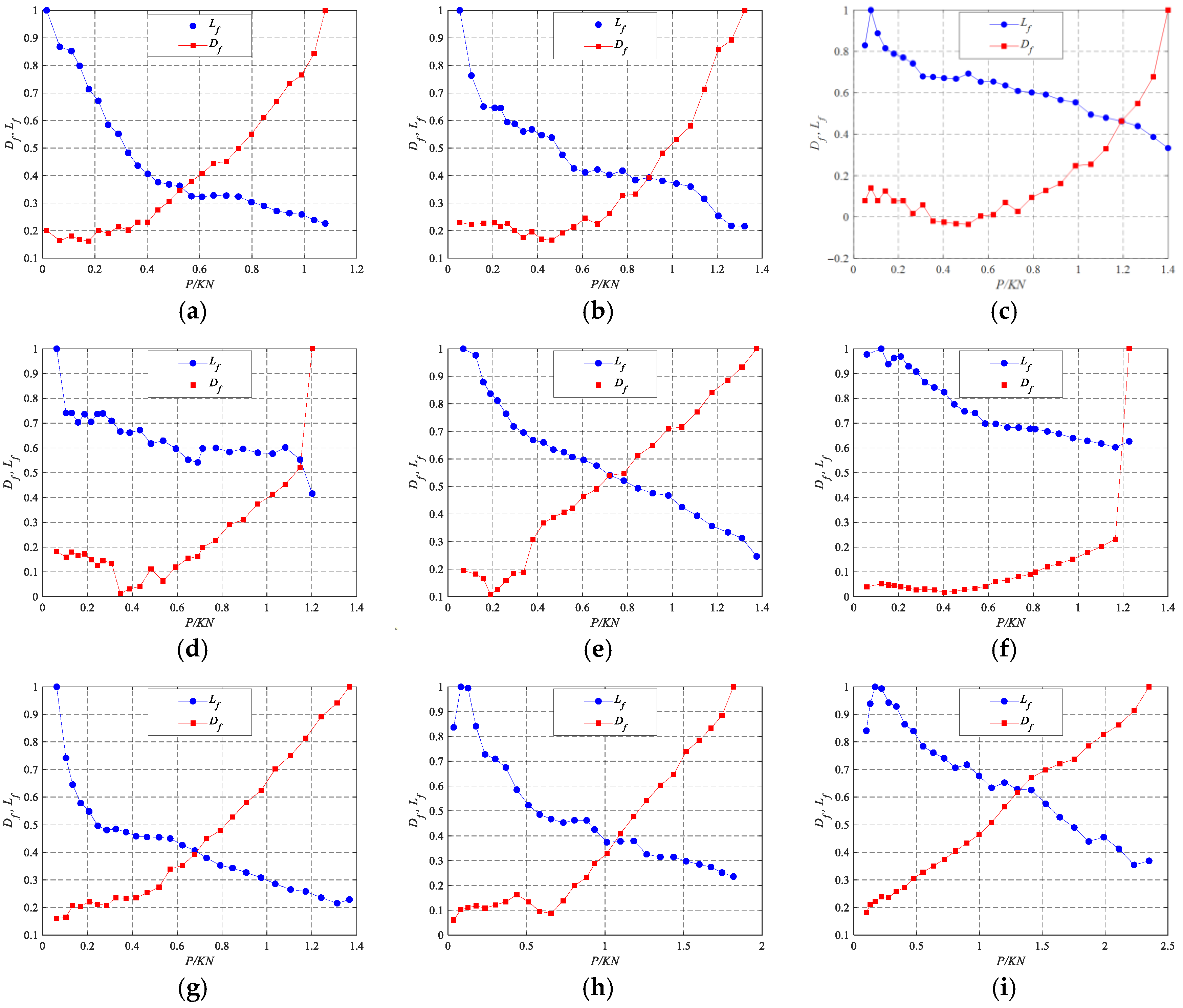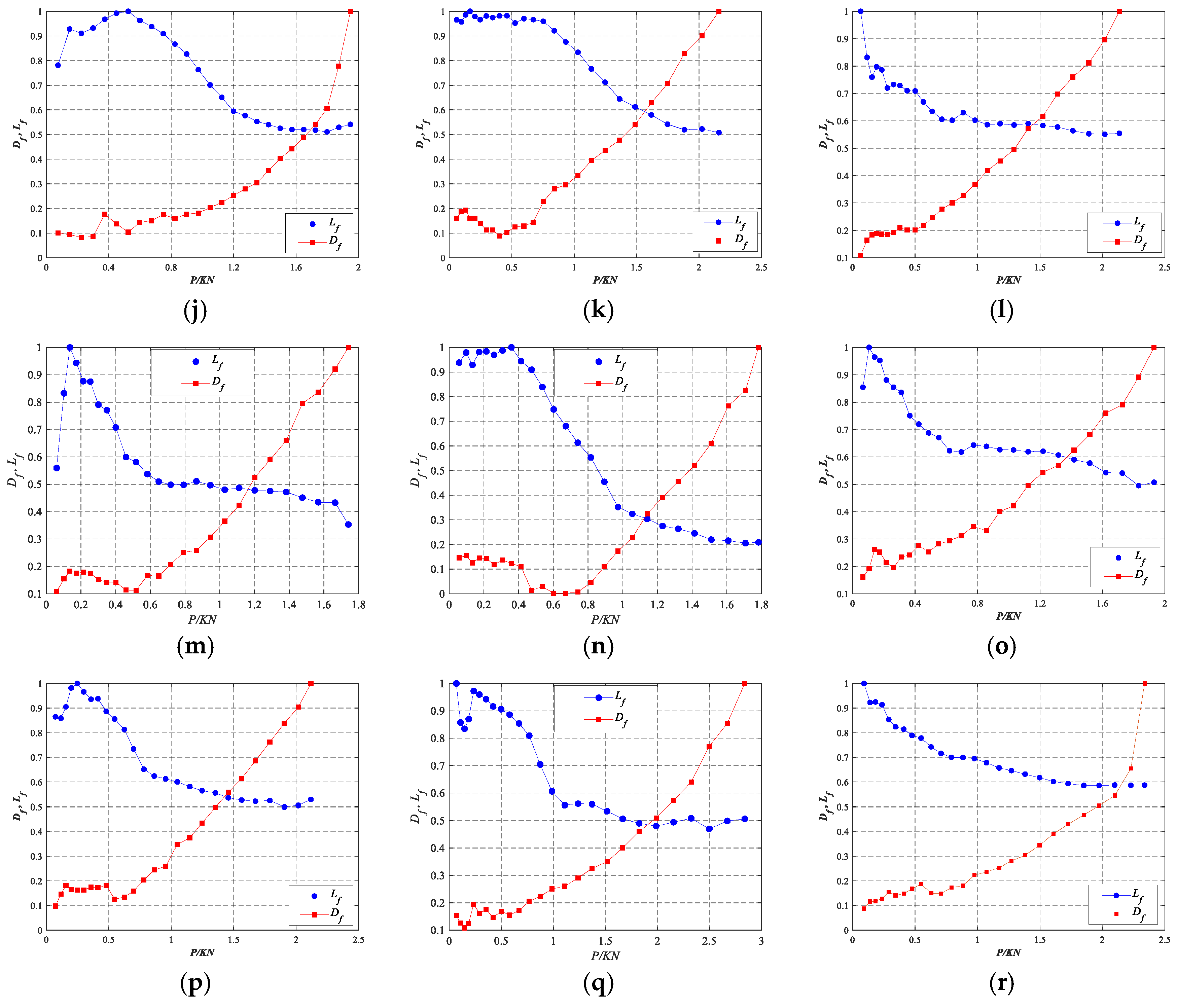 Figure 14 shows the load-dependent curves of and under different matrix densities and basalt fiber content. The results indicate that, despite differences in matrix density and fiber content, the load-dependent curves of and in all specimens exhibit similar trends. For : it can be divided into two stages. Stage I (low-value fluctuation stage): remains at a relatively low level overall, fluctuating within a certain numerical range. This indicates that the specimen has not yet undergone significant macroscopic damage at this load stage. Stage II (rapid growth stage): significantly increases and exhibits a rapid growth trend with increasing load. This indicates that the specimen has entered a distinct stage of damage development, with damage continuing to accumulate and intensify. For : it is also divided into two stages. Stage I (rapid decline stage): decreases significantly with increasing load. This change characteristic indicates that strain localization phenomena have occurred in the specimen during this stage, and the strain localization regions exhibit a multi-point concurrent trend. Stage II (slow decline stage): has decreased to a relatively low level, with a significantly slowed decline rate. This marks the significant development of damage localization, primarily due to the formation and continued development of the dominant damage zone, while the development of secondary damage zones has significantly slowed or even stagnated.