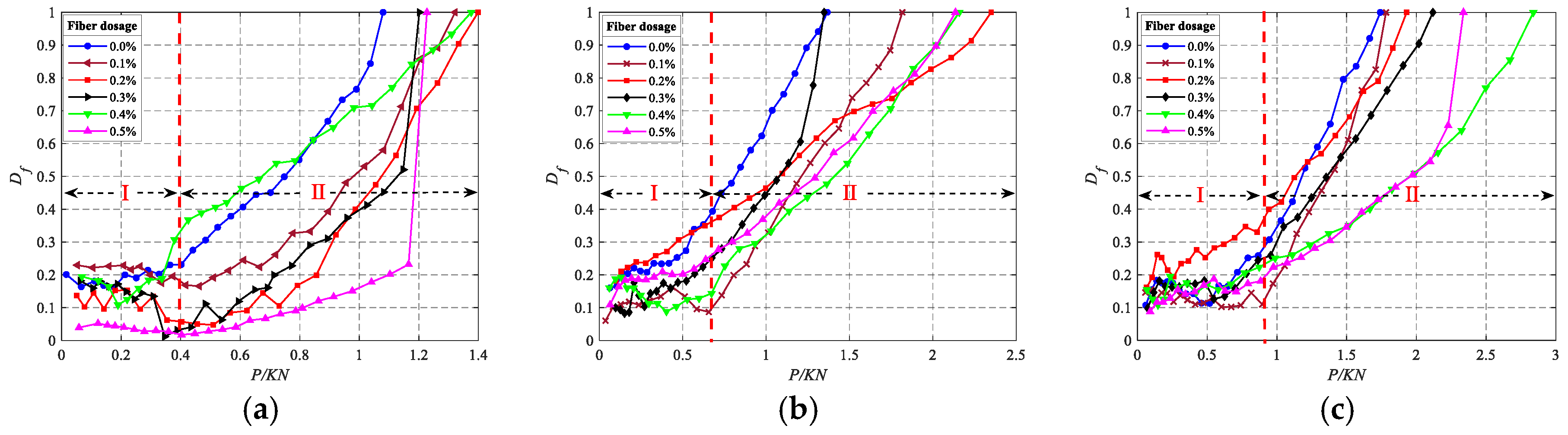 Figure 15 shows a comparison of the damage-load curves of specimens with varying basalt fiber content. The damage development process (damage extent-load curve) of basalt fiber foam concrete with different matrix densities can be divided into two stages. In stage I: the damage extent-load curves of specimens with different basalt fiber content all exhibit a gradual upward trend and have similar shapes. During this stage, the damage extent of basalt fiber foam concrete with different matrix densities are all below 0.4, indicating a low level and suggesting that the fibers have a very limited inhibitory effect on material damage evolution. Stage II: As the load increases, the rate of increase in the damage extent-load curves of specimens with different basalt fiber content accelerates significantly. At this point, the differentiated effects of fiber content on damage control become evident. The same basic pattern is observed under three different matrix densities: at the same load level, the higher the fiber content, the smaller the corresponding damage variable, indicating a lower degree of material damage. Conversely, a decrease in fiber content results in an increase in the damage variable and a faster growth rate of the damage. Consequently, the incorporation of basalt fibers not only significantly delays the material’s damage progression but also effectively increases its initial damage threshold load.