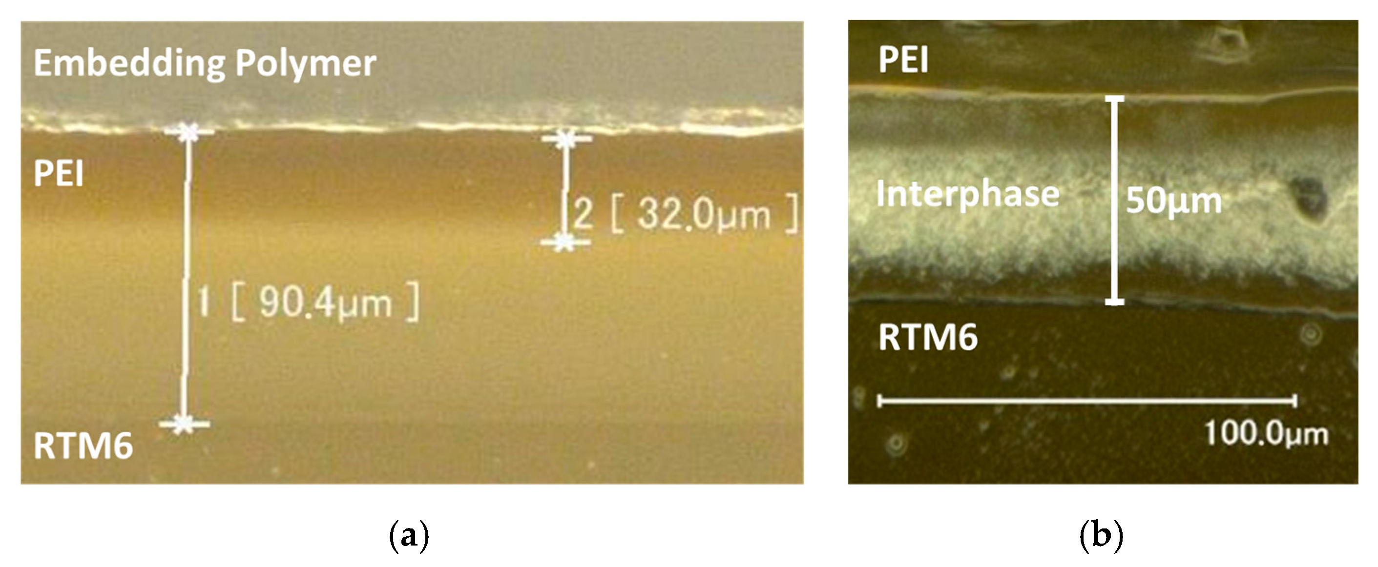 - Taubert, M.; Diez, J.G.; Musil, B.; Höfer, P. Comparing interphase formation in different thermoplastics combined with RTM6/M18 epoxy systems. Adv. Manuf. Polym. Compos. Sci. 2025, 11, 2482280. [Google Scholar] [CrossRef]