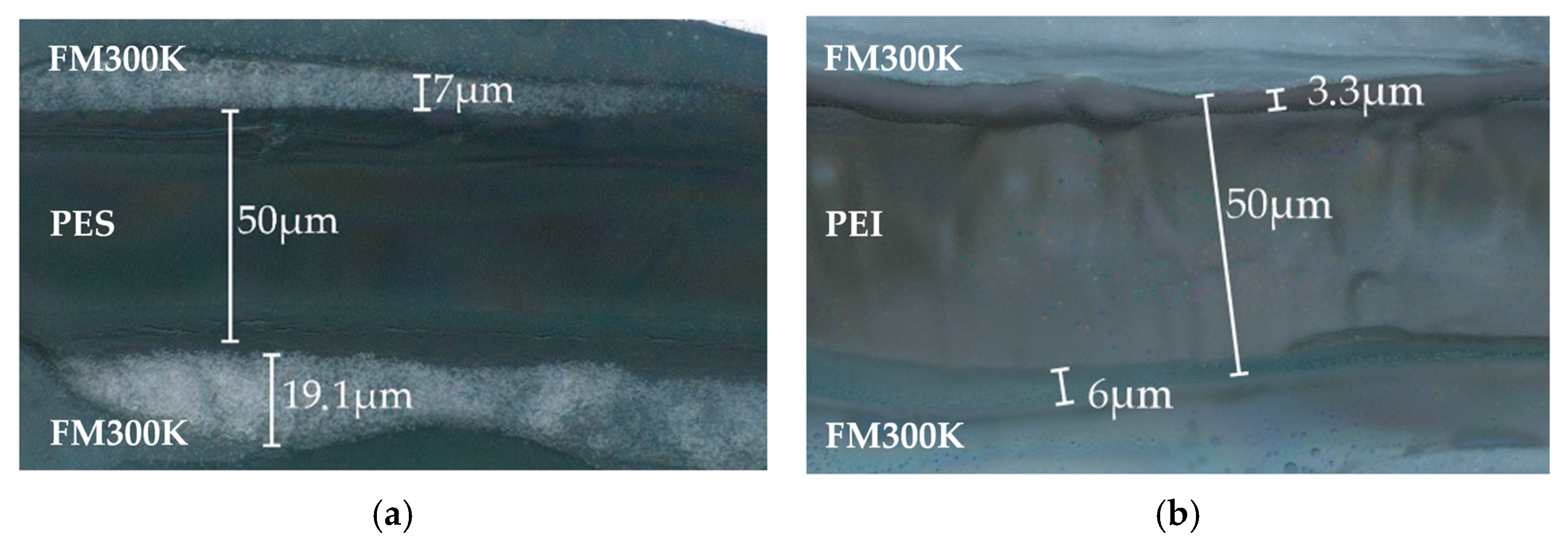 - Bruckbauer, P. Polyetherimid-Epoxidharz Interphasen zur Anbindung von Funktionsschichten auf Faserverbundwerkstoffen. Z. Für Kunststofftechnik 2017, 1, 35–56. [Google Scholar] [CrossRef]