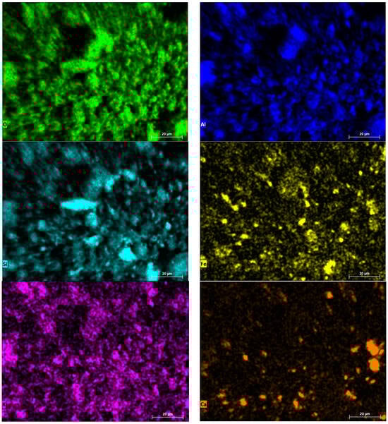 Silicon and aluminum are primarily concentrated in the silicate phases, iron is found in isolated mineral inclusions, and calcium and potassium are localized in certain areas, likely associated with minor carbonate and feldspar components.