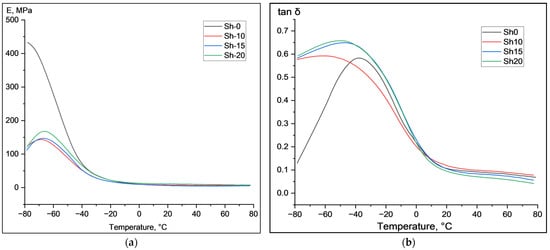 The data obtained by dynamic mechanical analysis (DMA) (Figure 5) clearly demonstrate that the incorporation of shungite filler into the polymer matrix significantly alters the viscoelastic behavior of the vulcanizates. In particular, the storage modulus (E′) decreases sharply at sub-zero temperatures (Figure 5a). For the sample without shungite (Sh0), E′ is 409 MPa at −75 °C, whereas for the shungite-filled samples (Sh10–Sh20), the peak E′ values are substantially lower: 158 MPa (Sh10, −64.7 °C), 140 MPa (Sh15, −45.1 °C), and 135 MPa (Sh20, −63.7 °C). This indicates a weakening of the glassy structure, accompanied by a decrease in stiffness and an increase in material flexibility at sub-zero temperatures. At the same time, the analysis of tan δ reveals a shift of the mechanical loss peak toward lower temperatures—from −36.7 °C for the sample without shungite Sh0 to −58.6…−46.0 °C for Sh10–Sh20—which indicates enhanced segmental mobility and a broader temperature range in which the shungite-filled samples retain elastomeric behavior and exhibit effective energy dissipation (Figure 5b). Taken together, these results confirm that shungite reduces glassy stiffness and modifies the temperature profile of energy dissipation, thereby improving the low-temperature performance characteristics of the vulcanizates.