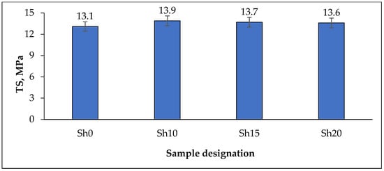 Despite the fact that the introduction of 10–20 phr of shungite alters the rheometric and viscosity characteristics of the rubber compounds, the tensile strength (TS) remains no lower than that of the control sample without shungite (Sh0) (Figure 5). The highest TS value (13.9 MPa) was recorded at a shungite content of 10 phr. When the amount was increased to 15 and 20 phr, the tensile strength slightly decreased (to 13.7 and 13.6 MPa, respectively), but still remained above the control level (Figure 6).