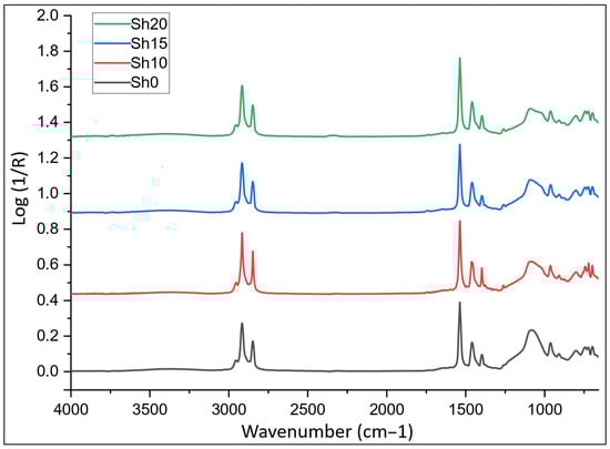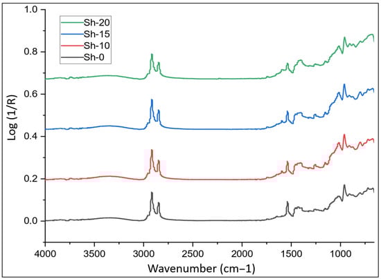The A950/A1080 ratio (Si–OH/Si–O–Si) decreases sequentially with increasing shungite content: Sh0 = 0.43; Sh10 = 0.36; Sh15 = 0.28; Sh20 = 0.31. This trend indicates a reduction in the fraction of free silanol groups Si–OH and an increasing degree of siloxane condensation/interfacial bonding, which is most pronounced at 10–15 phr of shungite. Such behavior indicates enhanced filler–filler and filler–matrix interactions driven by the presence of shungite.