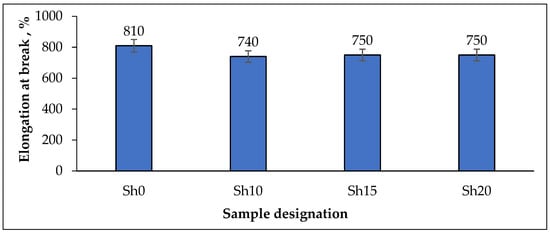 According to the data presented in Figure 8, the introduction of shungite within the studied concentration range results in a decrease in at break from 810% to 740–750%. Such a reduction in elongation is expected for mineral fillers and is associated with the partial restriction of macromolecular mobility; however, the range of variation remains relatively narrow, indicating that the material retains high deformability even at elevated shungite contents.