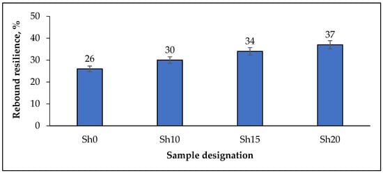 However, according to the data presented in Figure 9, increasing the shungite content leads to a rise in the rebound resilience of the rubbers—from 26% for the control sample (Sh0) to 37% at a filler loading of 20 phr (Sh20).