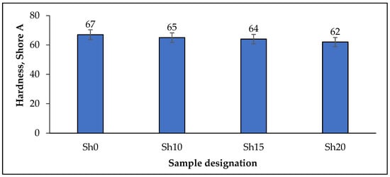 At the same time, the Shore A hardness of the vulcanizates decreases progressively from 67 to 62 units (Figure 10). This trend is fully consistent with the established regularities governing the influence of fillers on the properties of rubber composites: as demonstrated in several studies, the morphology, particle size, and dispersion of the filler have a pronounced effect on the stiffness and hardness of the material [44].