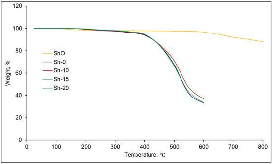 The combined data (namely, the minimum A950/A1080 ratio at Sh/BS-100 ratios of 10/35 and 15/30, the smallest loss in tensile strength at a Sh/BS-100 ratio of 10/35 (Sh10), and the increase in carbonized residue in the TGA curves (Figure 12) at ratios of 15/30 (Sh15) and 20/25 (Sh20)) indicate that the optimal shungite content lies in the range of 10–15 phr. Within this interval, a more stable interfacial layer is formed, and the best balance between tensile strength and thermal stability is achieved.