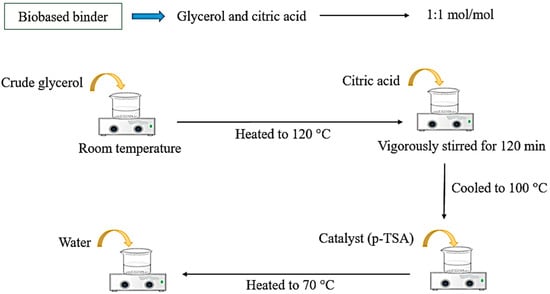 Glycerol was initially heated to 120 °C before citric acid was added. The solution was stirred vigorously for 120 min until the citric acid was completely dissolved. The mixture was then cooled to 100 °C, and 2% of the catalyst (p-TSA) (by total weight of the mixture) was added. Finally, the solution was cooled to room temperature. Before being used with fibers, the solution was mixed with water at 70 °C to facilitate its application as a binder (Figure 1). The amount of water added can vary depending on the desired viscosity and ease of use.