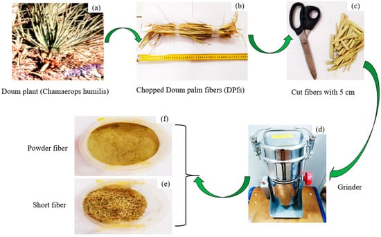 The use of Doum palm fiber (DPf) in scientific research has attracted attention due to its unique properties and potential applications in various fields, including in composites [1,2,3]. DPf, derived from the leaves of the Doum palm tree (Chamaerops humilis), is abundant in the Arabian Peninsula and northern Africa. It is characterized by its low density and favorable mechanical properties, making it a suitable candidate for the reinforcement of polymer matrixes [2,3].