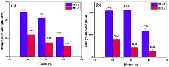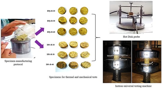 The mechanical characterization of the composites produced involved the assessment of compressive strength and Young’s modulus. These tests were carried out in accordance with ASTM D 3379-75 [31], using an Instron model 3369 universal testing machine to ensure accurate and reliable results. The equipment features a compression cell consisting of two parallel hardened stainless steel plates, ensuring uniform application of load during testing. A total of three specimens were tested per formulation.