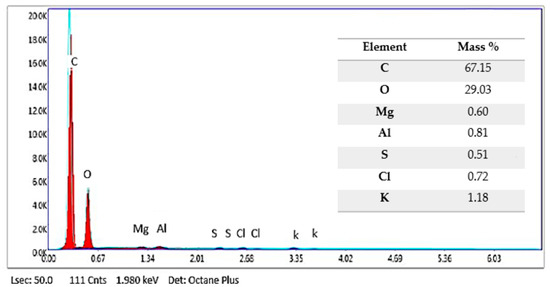 Table 4 shows the chemical compositions of DPfs in their raw state. The results show that the water content in the fibers was approximately 6.88%, while the dry matter content was 93.12%, the mineral content was 4.66% and the organic matter content was approximately 95.34%. These results were confirmed by energy dispersive X-ray (EDAX) analysis of the raw fiber, which contains low proportions of mineral matter (Mg, Al, S, Cl, K), as shown in Figure 4.