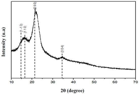 The diffractogram (Figure 6) of the raw DPfs showed lines characteristic of the typical structure of cellulose I. The latter is characterized by the main crystalline peaks located at approximately 14.9°, 16.3°, 21.4° and 34.4°, corresponding to the (1–10), (110), (200) and (004) typical reflection planes [34]. Several researchers have found that the position of the peak corresponding to the (200) crystallographic plane is approximately 2θ = 22.3°. However, in the case of the DPfs studied, this same peak was shifted to lower angles. This may indicate the presence of another polymorph, possibly cellulose IV. Thus, it appears that the lateral disorganization of cellulose I led to the cellulose IV polymorph [44,56].