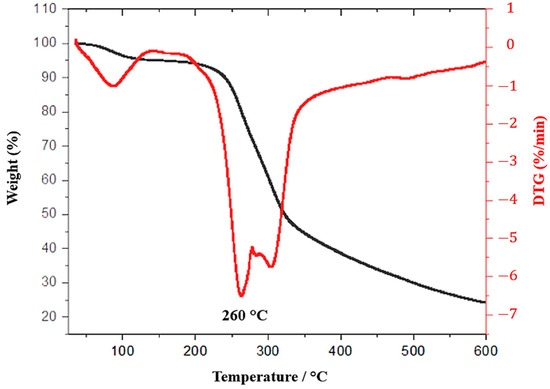 The thermal behavior of the DPfs was studied by thermogravimetric analysis (TGA) (Figure 7). Three weight losses are observed resulting from the decomposition of the different components of the fiber studied. The first weight loss is about 4.79% at 84 °C, attributed to the release of moisture-related water absorbed on the surface of a hydrophilic lignocellulosic structure [34,61]. The second significant weight loss is about 23.91% at 260 °C, related to the decomposition of hemicellulose and pectin and cleavage of cellulose glycosidic bonds [8,55,65]. The third weight loss (50% by weight) is noted at 305 °C and could be attributed to the breakdown of cellulose and lignin [59,66]. These results are in line with several studies that have referred to the thermal stability of natural fibers [34,67,68,69,70,71,72].