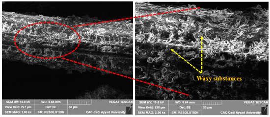 The surface morphology of DPfs, as shown in the SEM images (Figure 8), has characteristics typical of natural fibers. These fibers have a network of fibrils interconnected over their entire length by pectin and various non-cellulosic substances. This unique structure contributes to the overall mechanical properties of the fibers, thus enhancing their potential for use in composite materials [11,73,74]. The presence of these bonding compounds plays a crucial role in maintaining fiber integrity and functionality, as has been observed for other types of natural fibers [75,76,77,78].