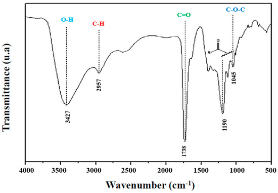 The structure of the ester was confirmed by FTIR peaks, whose characteristic bands are shown in Figure 9. A wide band at 3427 cm−1 is characteristic for hydroxyl groups of alcohols and acids, indicating incomplete conversion of hydroxyl groups in reagents [71,79]. The 2957 cm−1 band is characteristic of polyester C-H vibrations. The narrow band at 1738 cm−1 is characteristic of the carbonyl group, the narrow band at 1190 cm−1 is characteristic of the acyl group and the low band at 1045 cm−1 is characteristic of the alcoxy group. These bands prove that a polyester was obtained [25,80,81,82].