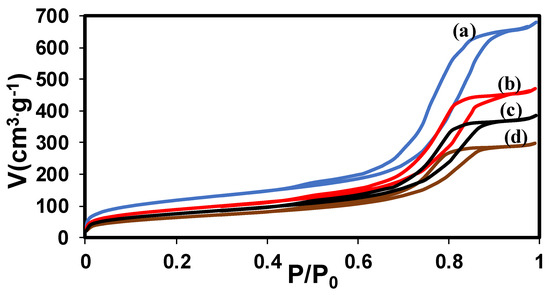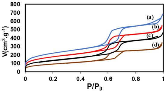 Specific surface areas, pore volumes, and main pore diameters were measured by N2 sorption using a BET apparatus (Micromeritics, Norcross, GA, USA). Specific surface areas were calculated on the basis of the relative pressure range (0.05–0.25), applying the Brünauer–Emmett–Teller (BET) method. The total pore volume was determined at a single relative pressure point (P/P0 = 0.98). In addition, The Barrett, Joyner, and Halenda (BJH) method was also applied to the desorption branch of the isotherm for analysis of pore size distribution. Microporous volumes were obtained using t-plots or alpha plots.