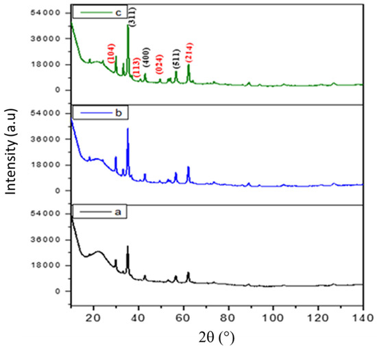 XRD diffraction patterns were recorded with a diffractometer equipped with Cu Kα radiation of 2S chloride impregnated (a) 2S (1) chloride; (b) 2S (2) chloride; (c) 2S (3) chloride. Main crystalline phase (indexation in black): spinel ZnFe2O4. (Indexation in red): hematite.