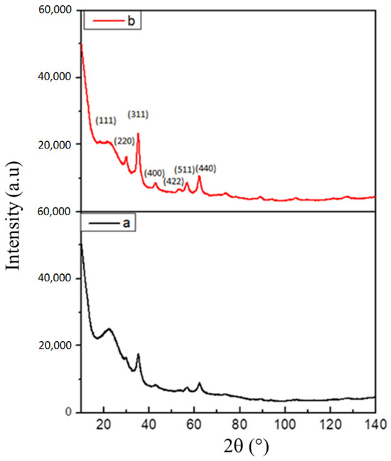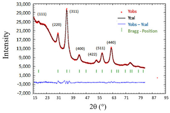 X-ray diffraction (XRD) measurements were performed using a Bruker ADVANCE D8 diffractometer (Bruker, Billerica, MA, USA) with Bragg–Brentano geometry, operating at 40 kV and 30 Ma. The instrument uses Cu Kα radiation (λ = 1.5418), consisting of a mixture of Cu Kα1 (1.54056 Å) and Cu Kα2 (1.54439 Å) components in a relative intensity ratio of 1:2. A Lynx Eye detector was used for precise data acquisition. Diffraction patterns were recorded over the range of 5 < 2θ < 90°.
