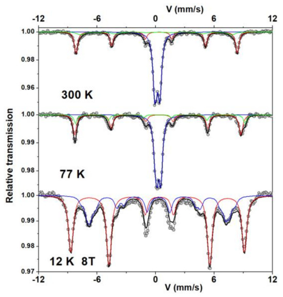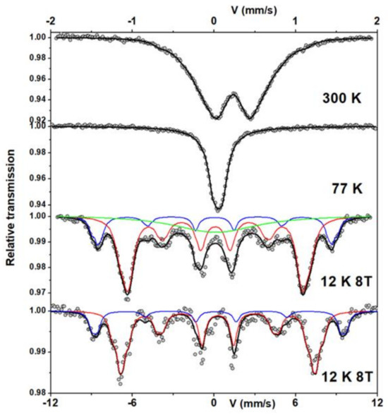 Mössbauer spectra obtained at 300 and 77 K for sample 2 S (3) and at 12 K in presence of an external magnetic field of 8T applied parallel to the γ-beam. The blue, green and red line corresponds to the ZnFe2O4 phase, poorly crystallized particles and highly crystallized particles of hematite, respectively.