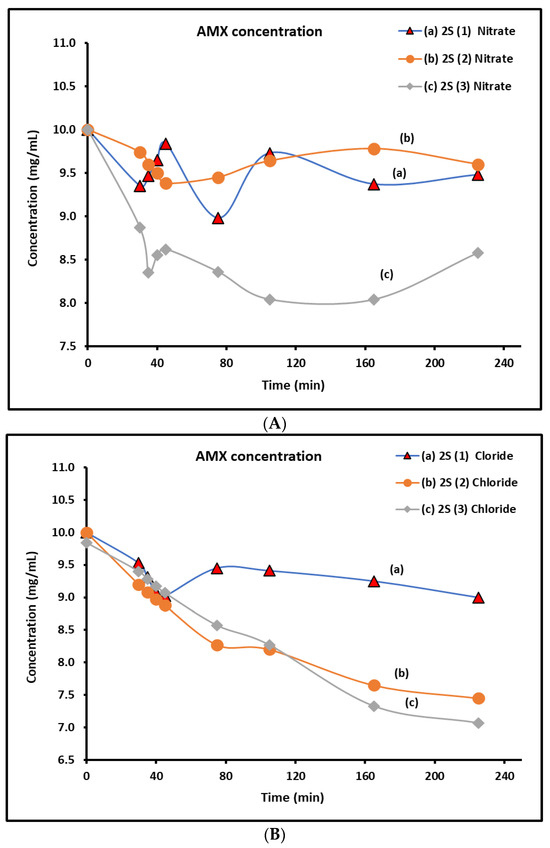 (A) Evolution of AMX concentration for photocatalytic tests in the presence of (a) 2S (1); (b) 2S (2); (c) 2S (3) nitrate (all samples are calcined). The concentration incertitude was between 0.02 and 0.04 mg/mL. (B) Evolution of AMX concentration for photocatalytic tests in the presence of (a) 2S (1), (b) 2S (2), (c) 2S (3) chloride samples (all samples are calcined). The concentration incertitude was between 0.02 and 0.04 mg/mL.